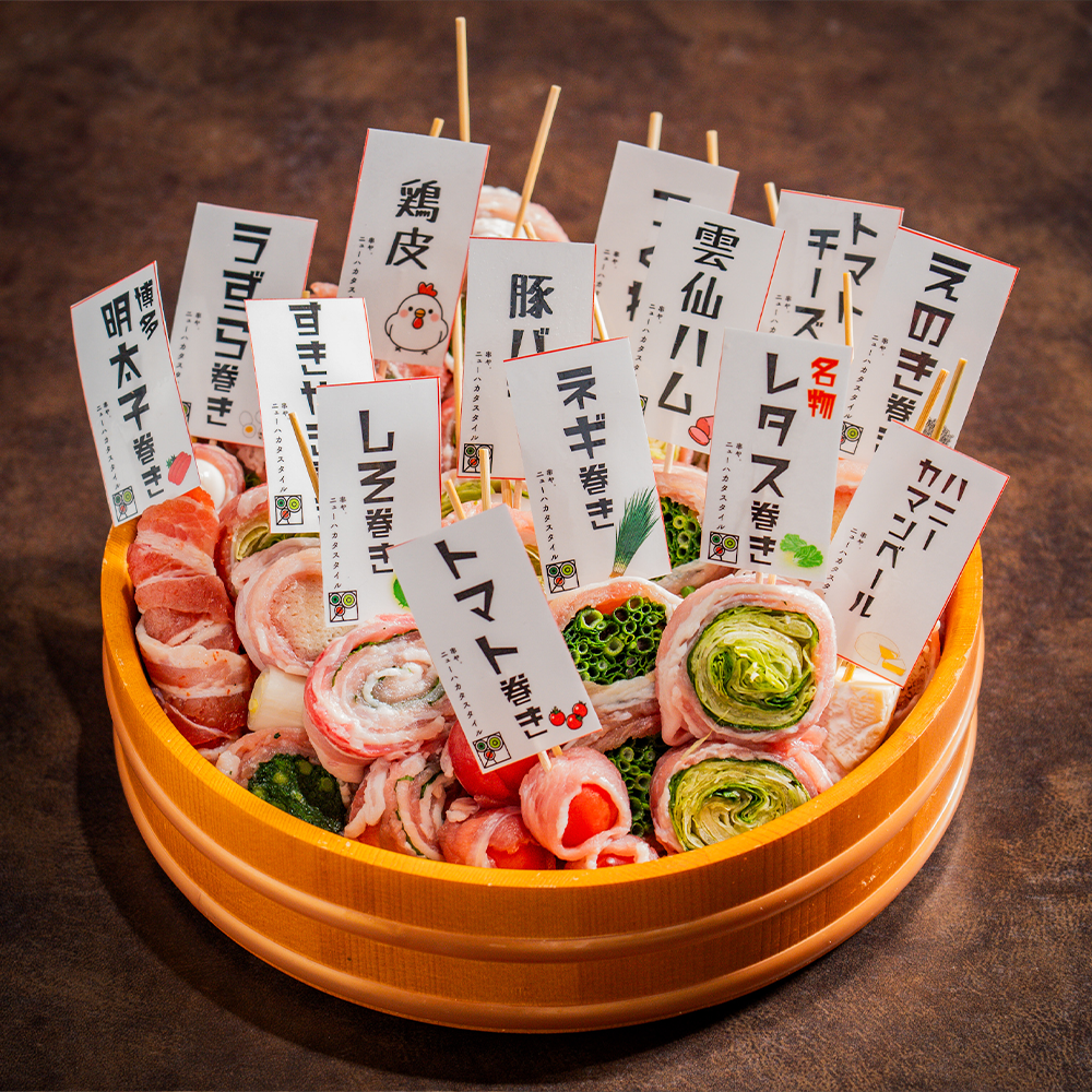 プリップリのもつ鍋と名物野菜巻き串で味わう本場博多の逸品。
